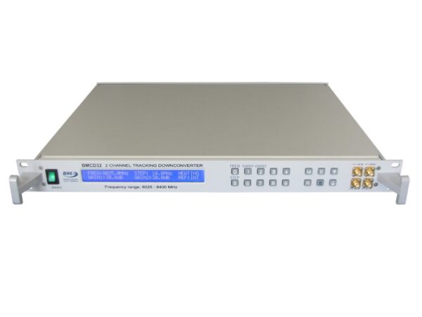 This double conversion downconverter is intended for use in professional applications in X-band such as satellite earth stations. BMCD32 includes dual high performance downconverter moduls with common low noise local oscillators, microprocessor based monitor and control circuitry, a front panel with control keys and status display and own AC / DC power supply. BMCD32 can be controlled from the front panel (manual control) and via Ethernet (remote control).
