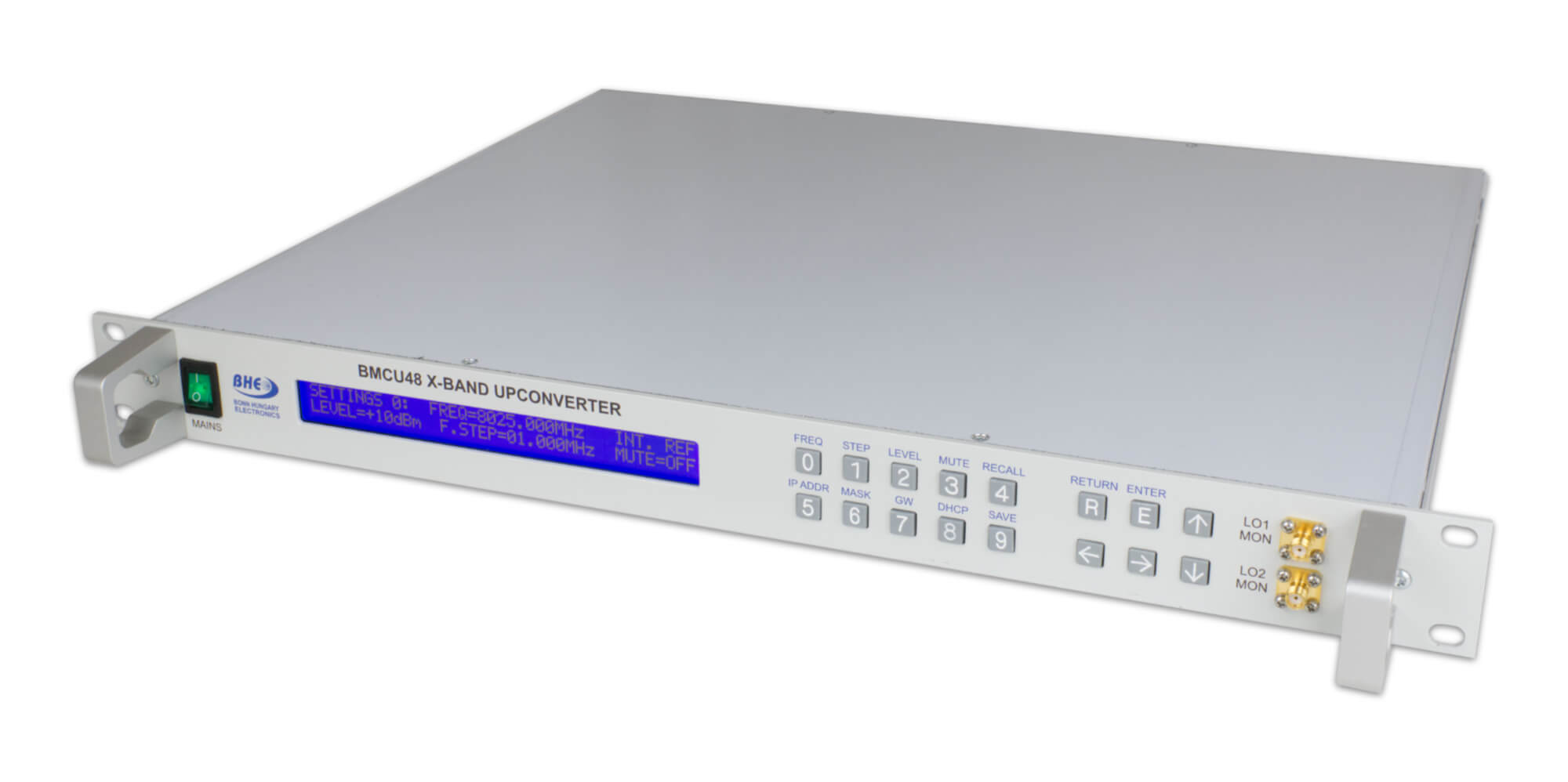 This high performance upconverter is intended for use in professional applications in X-band such as satellite earth stations. This device includes a double conversion upconverter modul with low phase noise local oscillators, a microprocessor based monitor and control circuitry, a front panel with control keys and status display and internal AC / DC power supply. The equipment can be controlled from the front panel (local control) and via TCP/IP over Ethernet (remote control). ALC circuit for precise output level control.